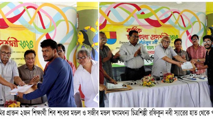 খুলনা আর্ট একাডেমির প্রাক্তন দুজন শিক্ষার্থী “শিব শংকর মন্ডল ও সজীব মন্ডল স্বনামধন্য চিত্রশিল্পী রফিকুন নবী স্যারের হাত থেকে পুরস্কার গ্রহন করেন